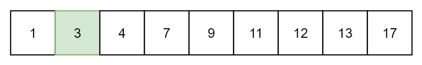 high는 9의 인덱스인 4에서 1을 빼서 3이 된다. low는 변경 없으므로 (0+3)/2 = 1이 된다. 인덱스 1의 값 3을 탐색