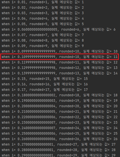 System.out.println("when i= " + i + ", rounded=" + (int)(i * 100) + ", 실제 예상되는 값= " + (int)(i * 100 + 0.5));