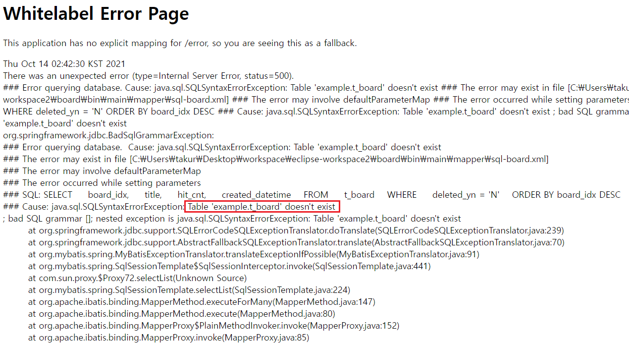 org.springframework.jdbc.BadSqlGrammarException: ### Error querying database. Cause: java.sql.SQLSyntaxErrorException: Table 'example.t_board' doesn't exist ### The error may exist in file [C:\Users\takur\Desktop\workspace\eclipse-workspace2\board\bin\main\mapper\sql-board.xml] ### The error may involve defaultParameterMap ### The error occurred while setting parameters ### SQL: SELECT board_idx, title, hit_cnt, created_datetime FROM t_board WHERE deleted_yn = 'N' ORDER BY board_idx DESC ### Cause: java.sql.SQLSyntaxErrorException: Table 'example.t_board' doesn't exist