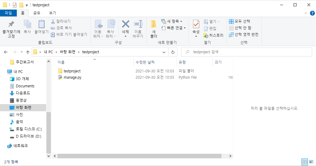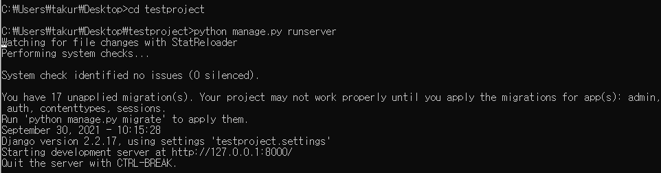 django-admin startproject testproject # 프로젝트 생성