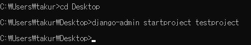 cd 명령어를 사용해 Desktop으로 들어가서 위와 같은 명령어로 testproject를 생성한다.