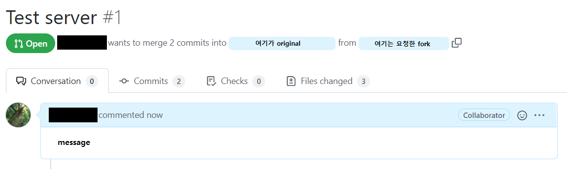 ( 아래에서부터는 pull request 요청을 받은, 권한을 가진 contributor만 진행이 가능하다. 결국 forked에서 요청을 받은 후 original에서 pull을 하고 병합하기 때문에 pull request라는 이름이...)