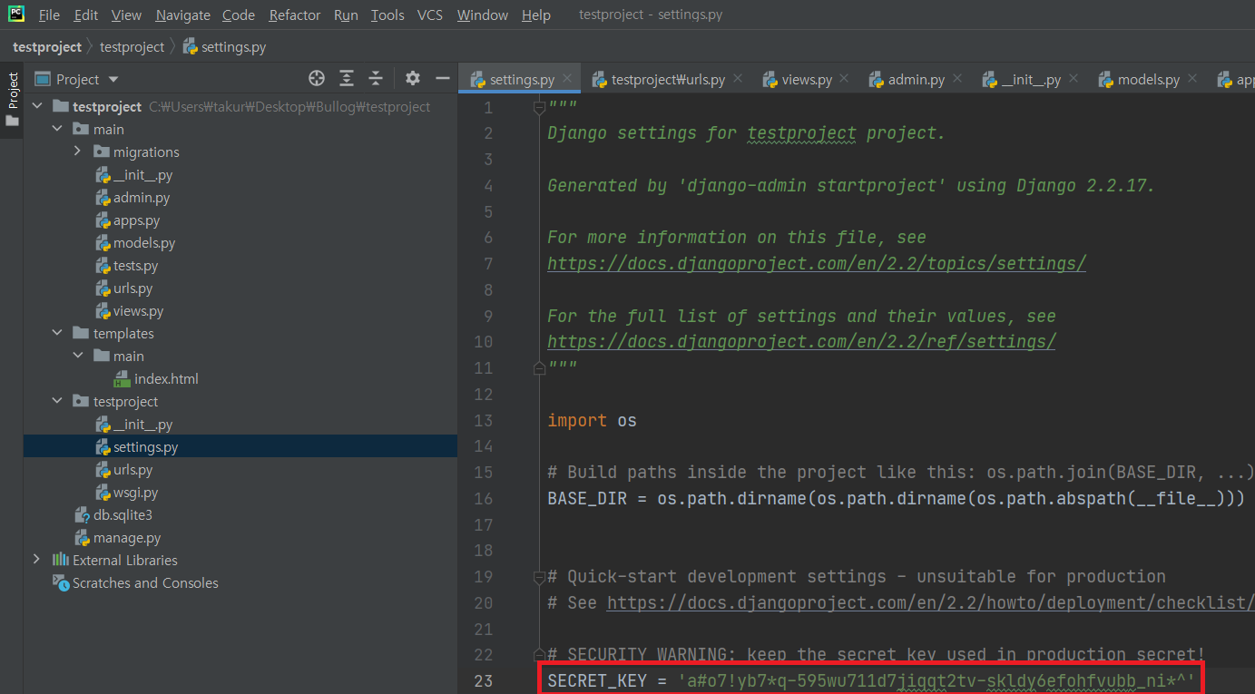 testproject/testproject/settings.py에 있는 내용을 살펴보면 아래와 같이 SECRET_KEY가 있다.