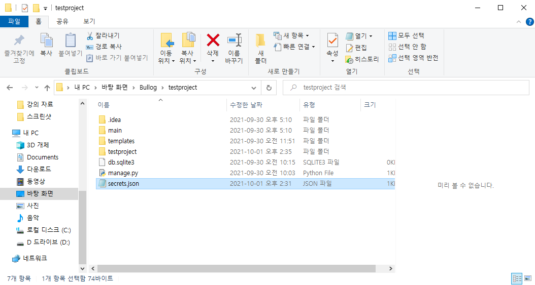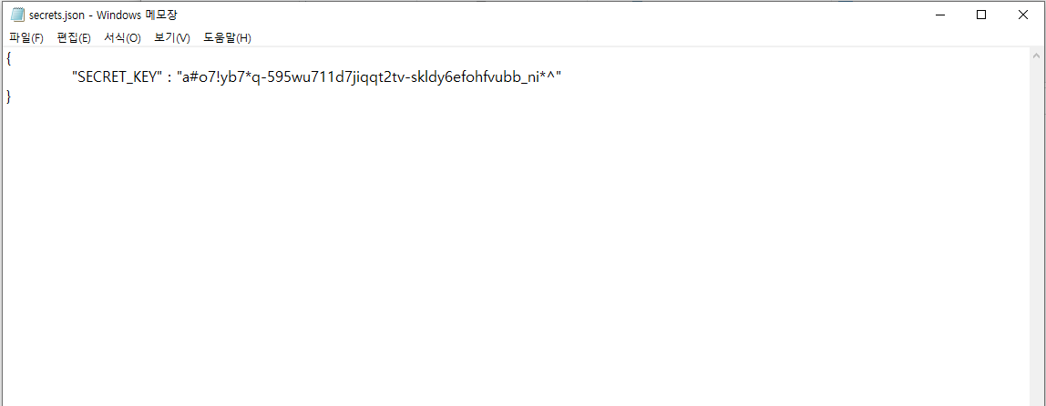 이 SECRET_KEY 값을 다루는 방법은 많지만 대게 .json 파일로 분리하여 관리한다.