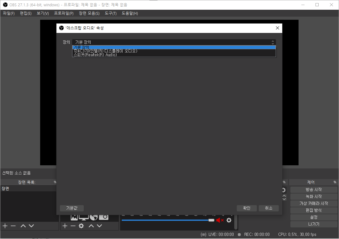 4. 만약 화면에서 송출하는 소리가 잡히지 않는다면 저기 데스크탑 오디로의 톱니바퀴(설정 버튼)를 우클릭한다.