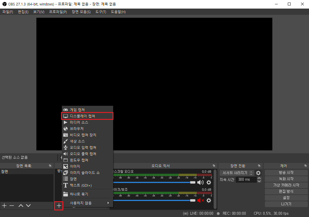 + 버튼을 누르고 디스플레이 캡쳐를 누른다.