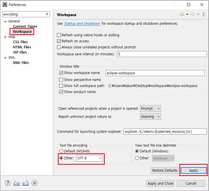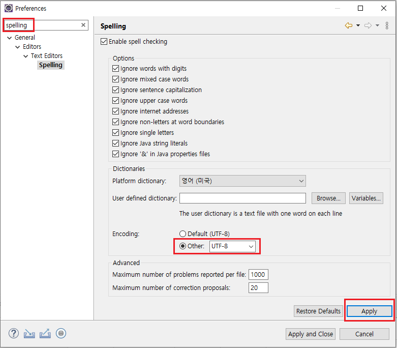 5. 검색창에 spelling을 입력하고 다음과 같이 UTF-8을 지정한 후 Apply 누른다. 니가 숨어있어 봐야