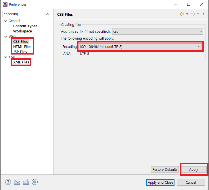 4. 좌측의 모든 Files로 끝나는 녀석들을 도장깨기 한다. ISO 10646/Unicode(UTF-8)