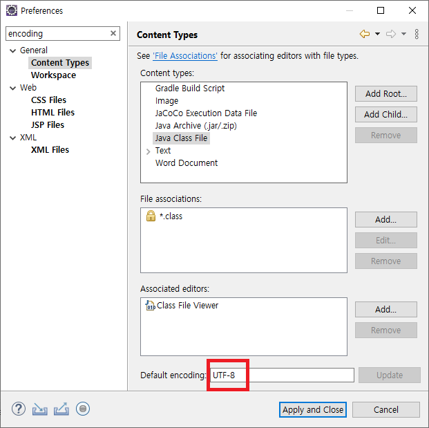2. 검색 창에 encoding 입력 후 순서대로 UTF-8 입력하고 Update 버튼을 누른다.