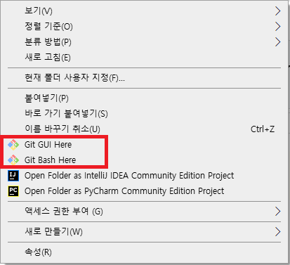 4. 위에서 Git Bash Here를 클릭 후 초기 설정 진행