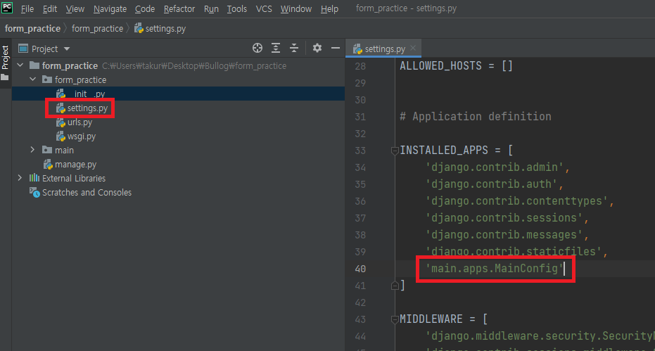 그 다음은 역시, settings.py의 최소한의 기본 설정을 해준다. 생성한 App을 인식하기 위해 INSTALLED_APPS에 등록.